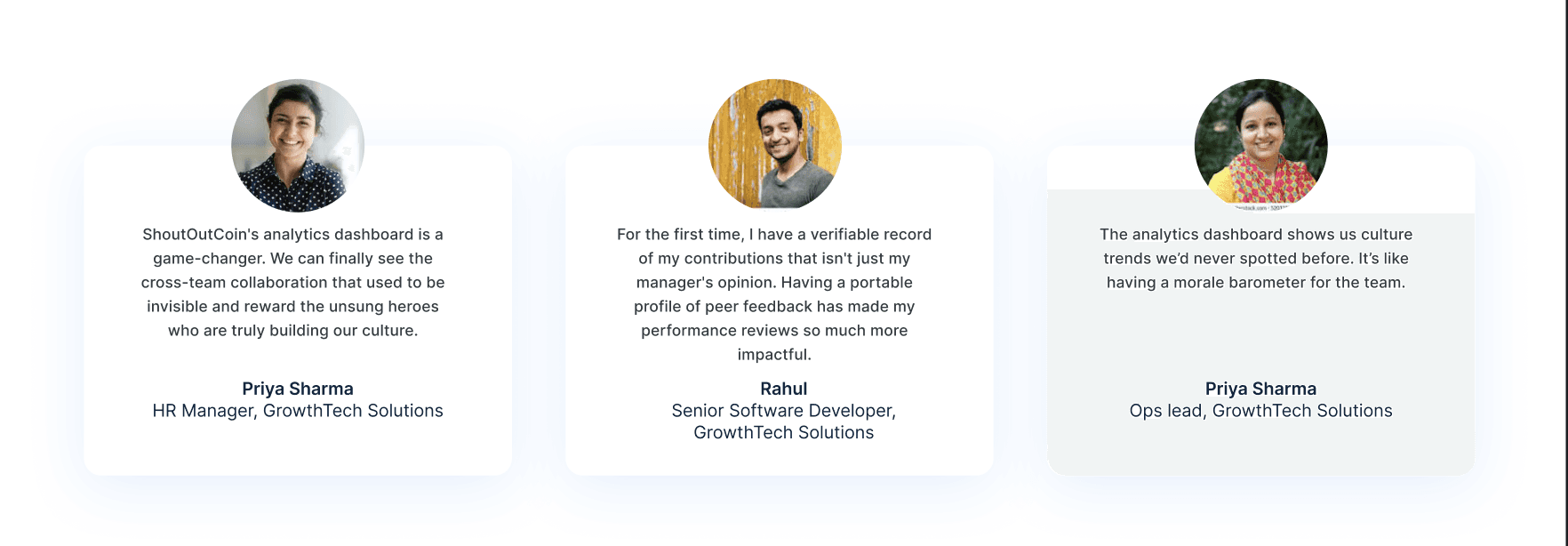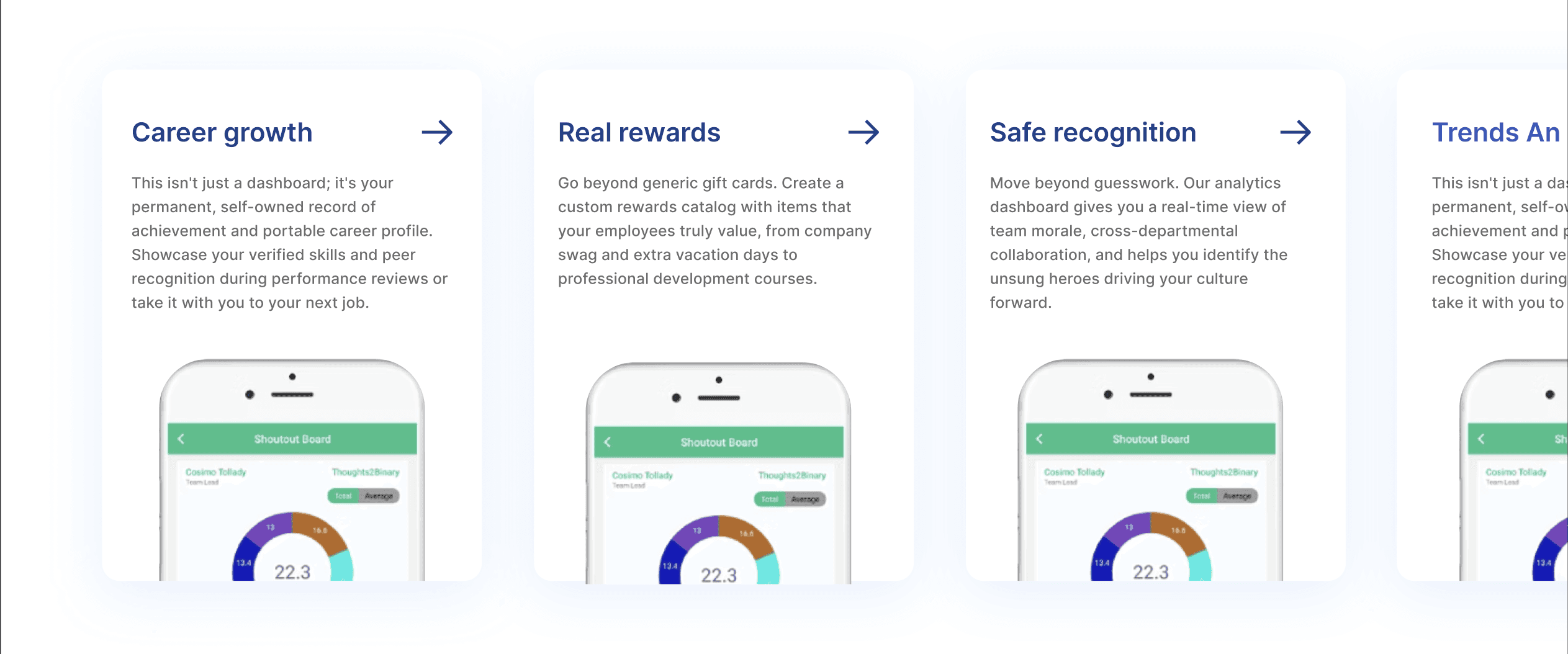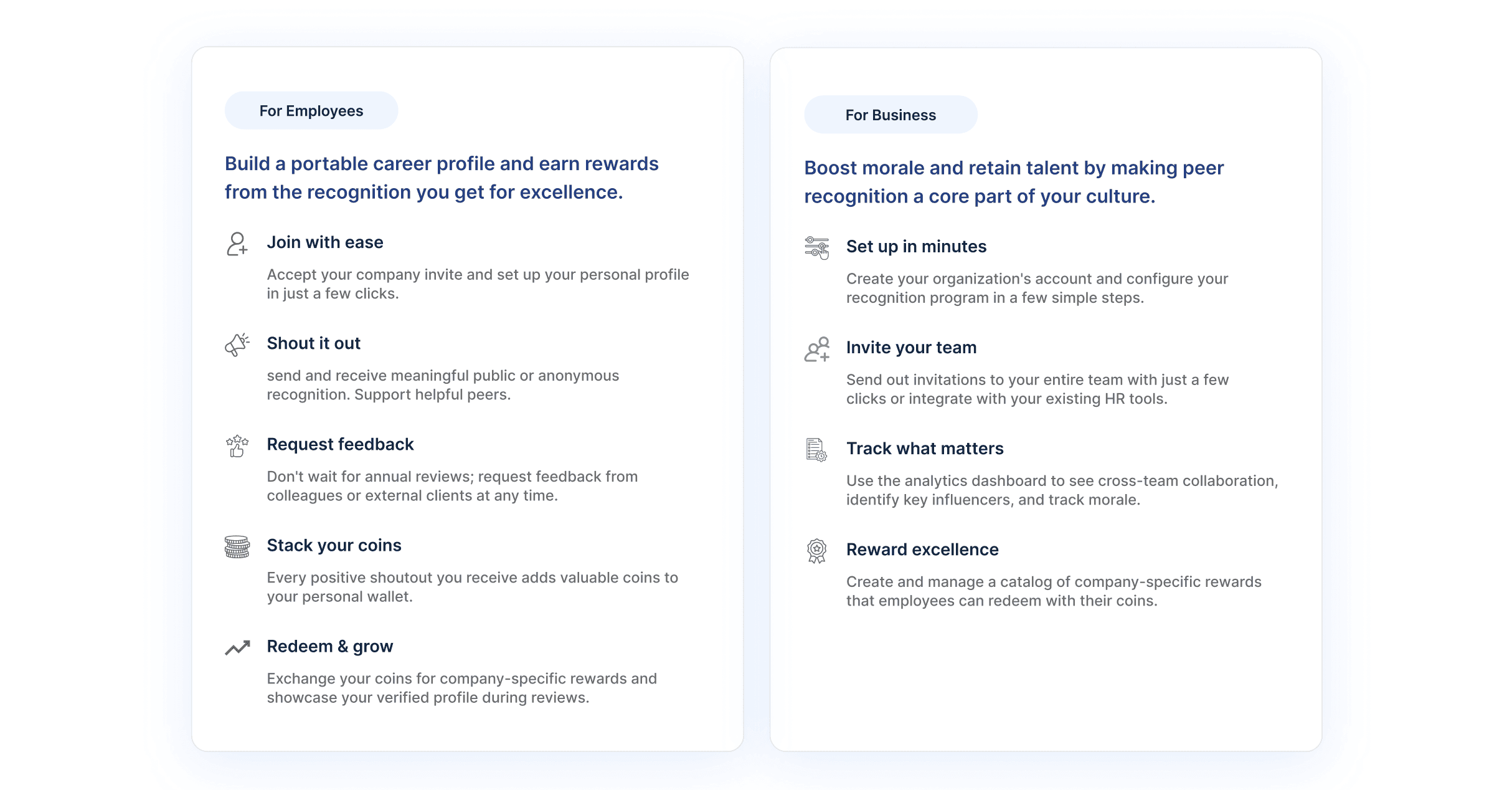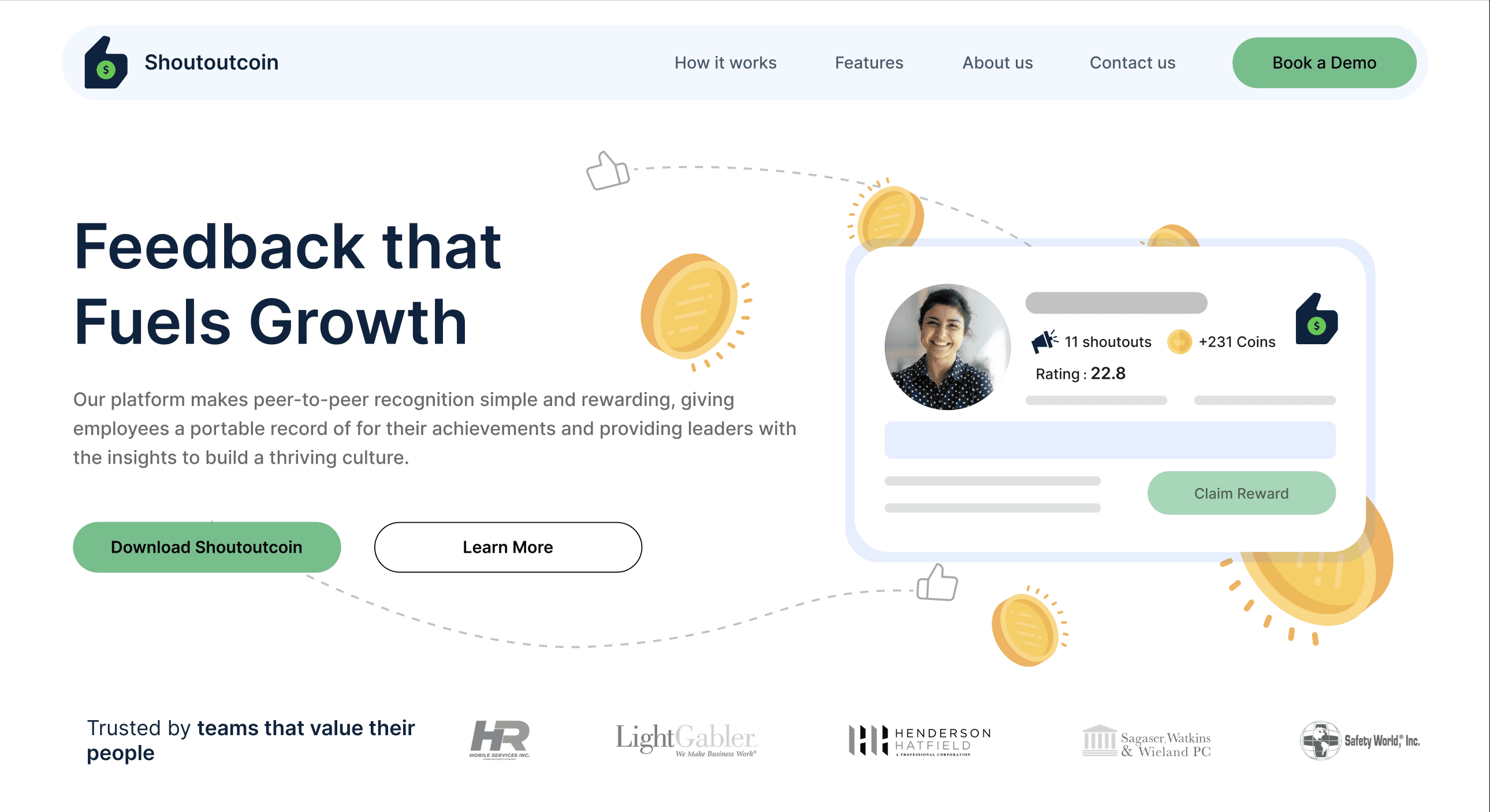 ShoutOutCoin is a workplace recognition platform that allows employees to give and receive anonymous feedback and earn rewards. I redesigned the public landing page to improve clarity, visual hierarchy, and conversion by better communicating the product’s value to both HR teams and employees.
